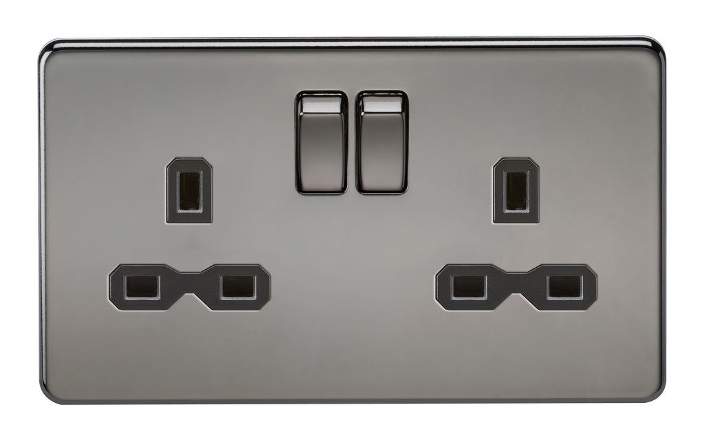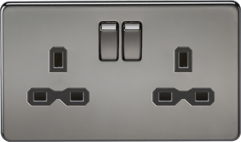The Knightsbridge SF9000BN / SF9000BNW 13A 2G Black Nickel Switched Socket is the ideal decorative upgrade for use in the modern home, businesses and hotels. The screwless design features an easy clip-on cover with an internal gasket for moisture protection and matching screws. It has an ultra-slim profile and is constructed from durable, and high-temperature resistant thermoset plastic.