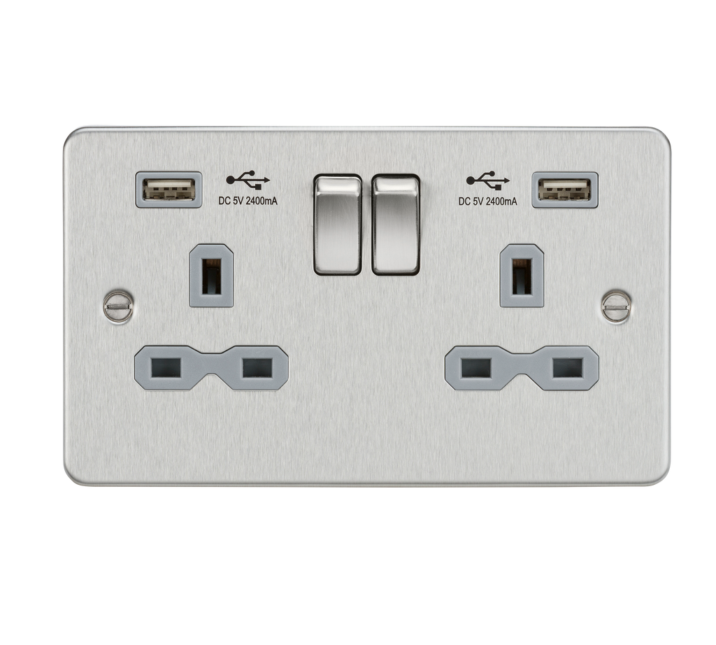 This charger socket is a great finishing touch to any modern home. Flat Plate low profile metal design with matching metal rocker. Built in Dual USB Charger - 13A Switched sockets - Dual USB Charging 5V DC2.4A (shared) - Ultra low profile design with built in gasket - Certified to BS1363-2:2016, EN 62368-1, EN 62680-1-1, EMC and ErP Certified - Minimum mounting box depth 25-35mm* *dependent on wiring conditions WE RECOMMEND YOU ALWAYS USE CERTIFIED USB CABLES FOR SAFETY AND TO ENSURE COMPATIBILITY