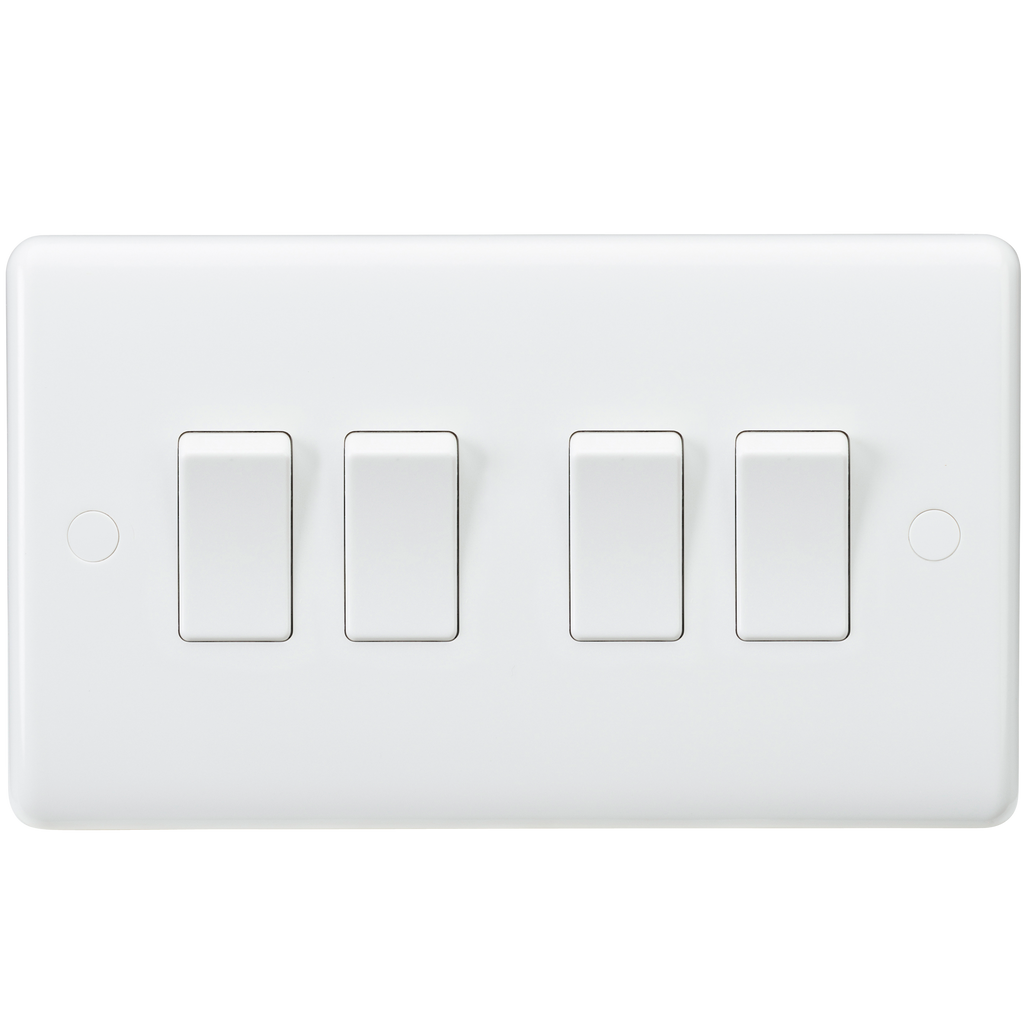 Gently contoured 7mm plate with rounded edges and anti-microbial properties - 10AX rated - 4G 2-way on double plate - Includes screw cap covers - Certified to EN 60669-1 - Supplied in Knightsbridge rip top polybag with euro slot