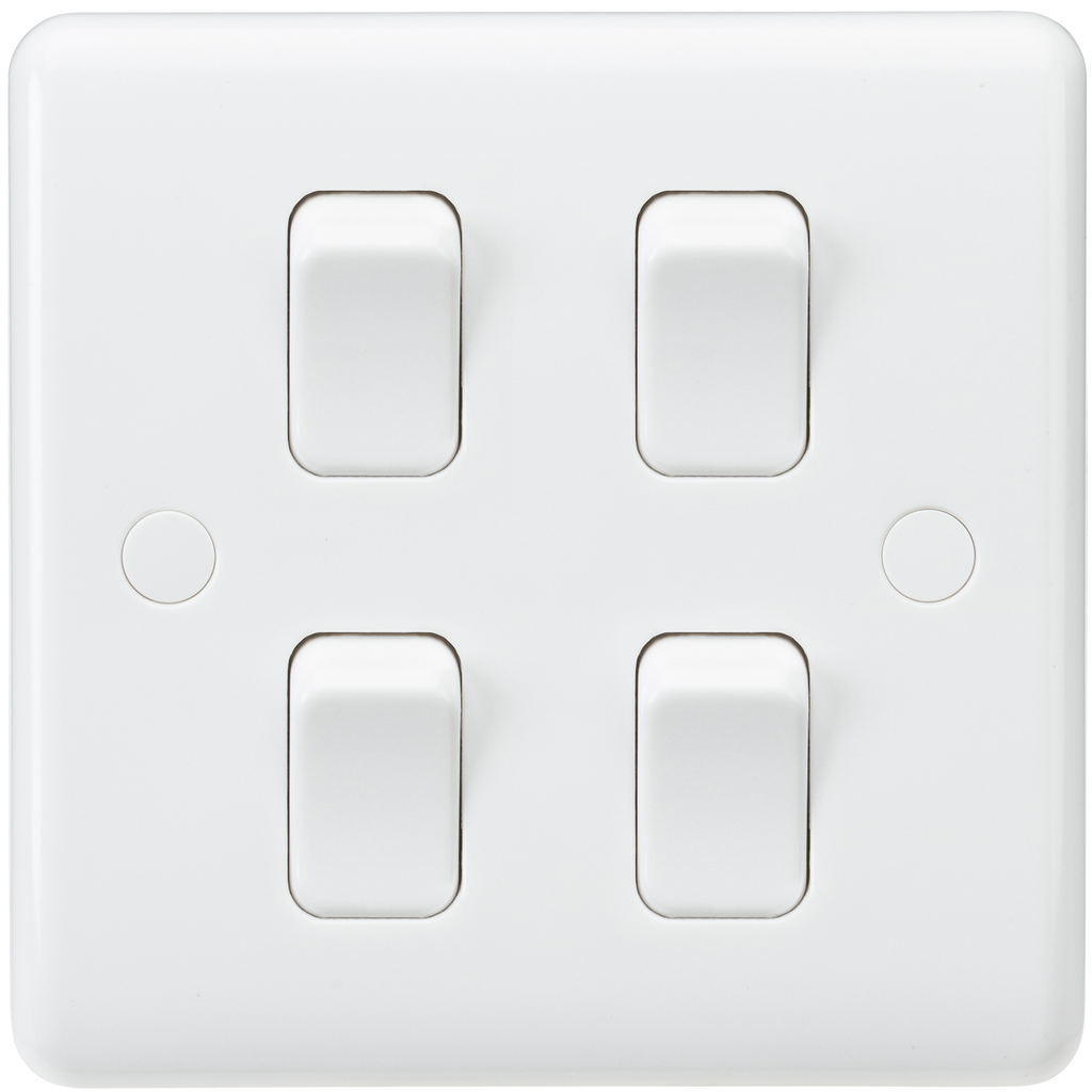 Gently contoured 7mm plate with rounded edges and anti-microbial properties - 10AX rated - 4G 2-way on single plate - Includes screw cap covers - Certified to EN 60669-1 - Supplied in Knightsbridge rip top polybag with euro slot