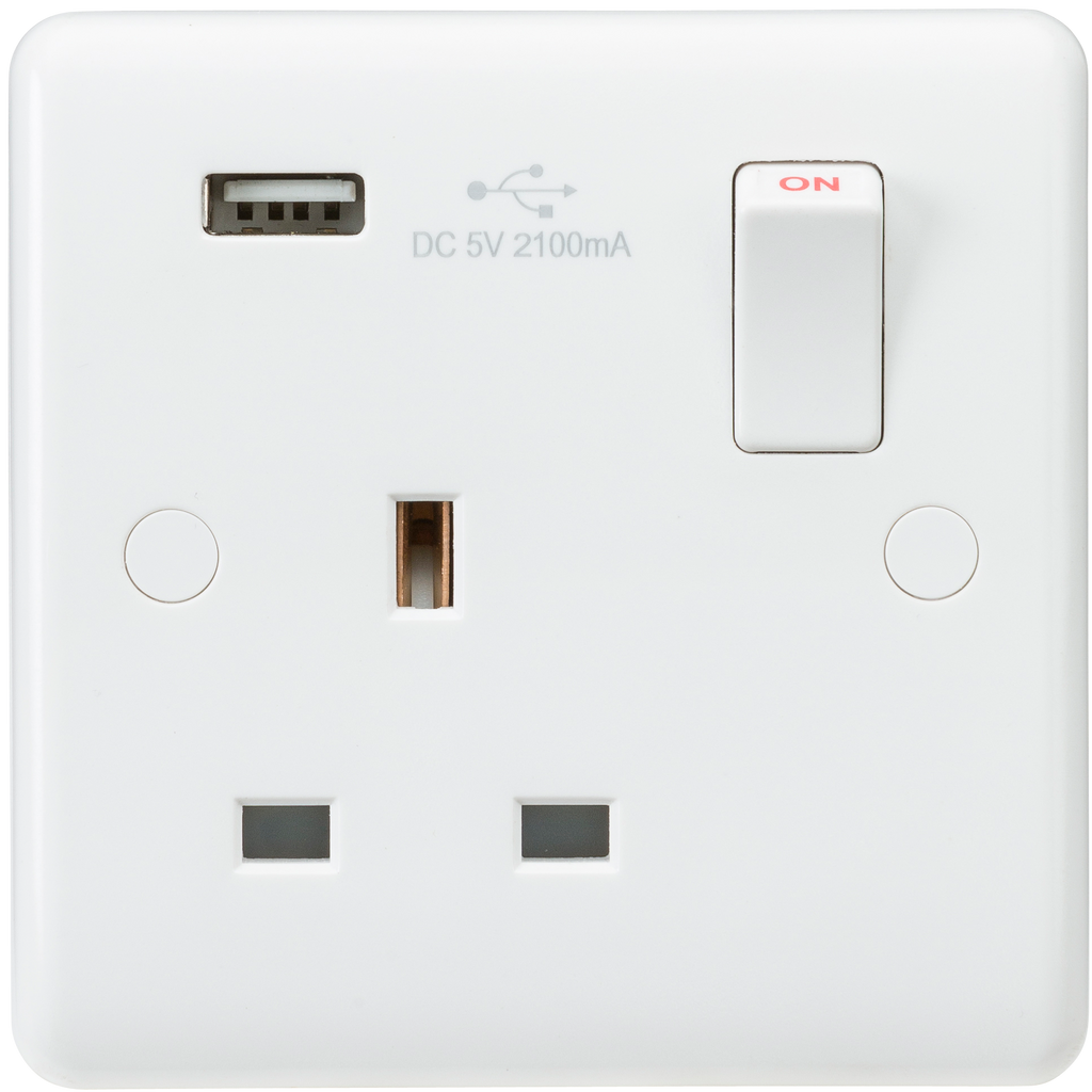 Gently contoured 7mm plate with rounded edges and anti-microbial properties - 13A rated - Built in USB Charger 5V DC 2.1A - Includes screw cap covers - Min. Mounting box depth: 25mm - Certified to BS 1363-2, EN 60950-1 - Packed in Individual Knightsbridge rip top polybag with euro slot NB: requires 35mm deep patress box if surface mounting (CU1700) WE RECOMMEND YOU ALWAYS USE CERTIFIED USB CABLES FOR SAFETY AND TO ENSURE COMPATIBILITY