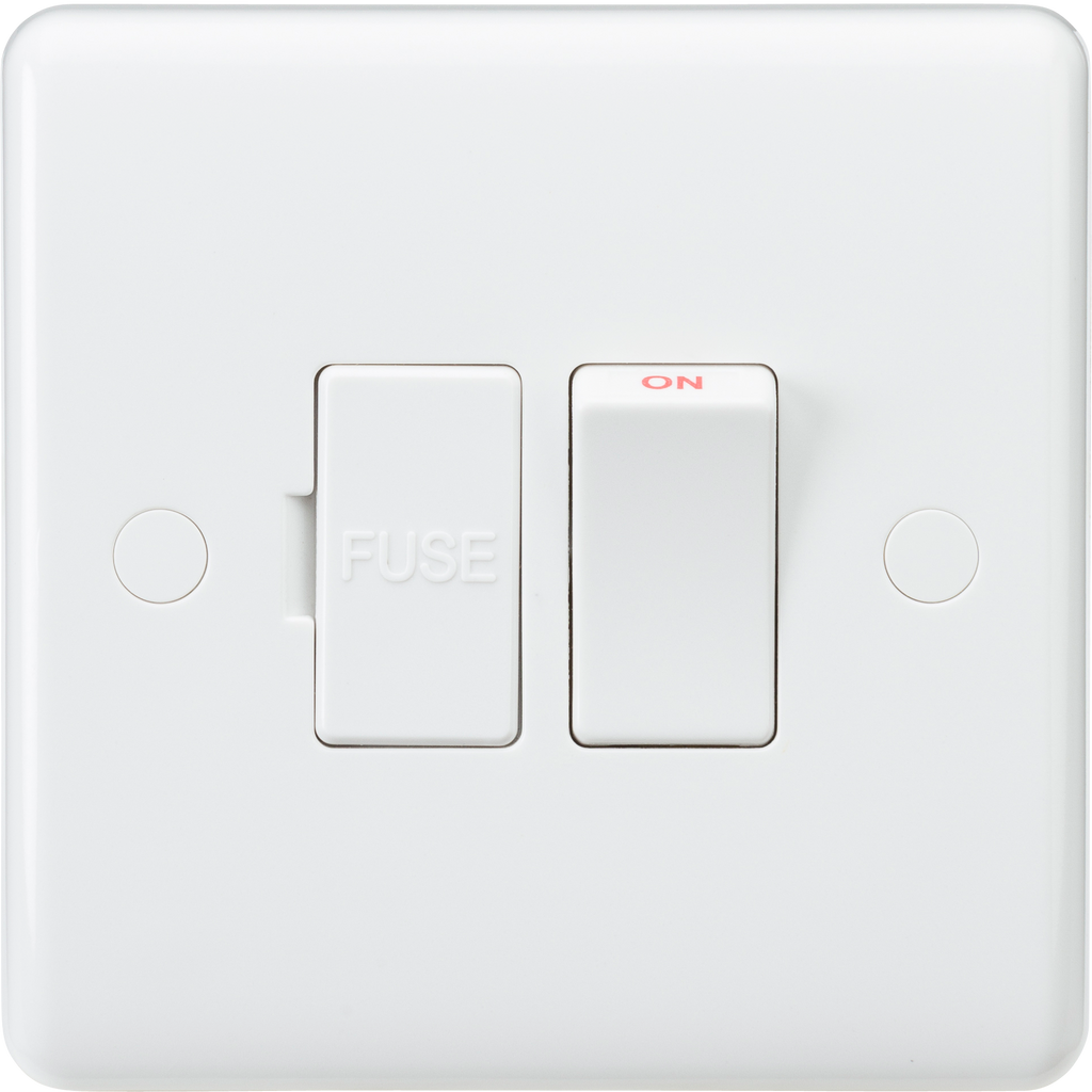 Gently contoured 10mm plate with rounded edges and anti-microbial properties. Additional depth on plate is too allow for cable exit from base of unit. - 13A rated - Switched Fused Spur unit - With flex outlet from base - Includes screw cap covers - Certified to BS 1363-2 - Supplied in Knightsbridge rip top polybag with euro slot