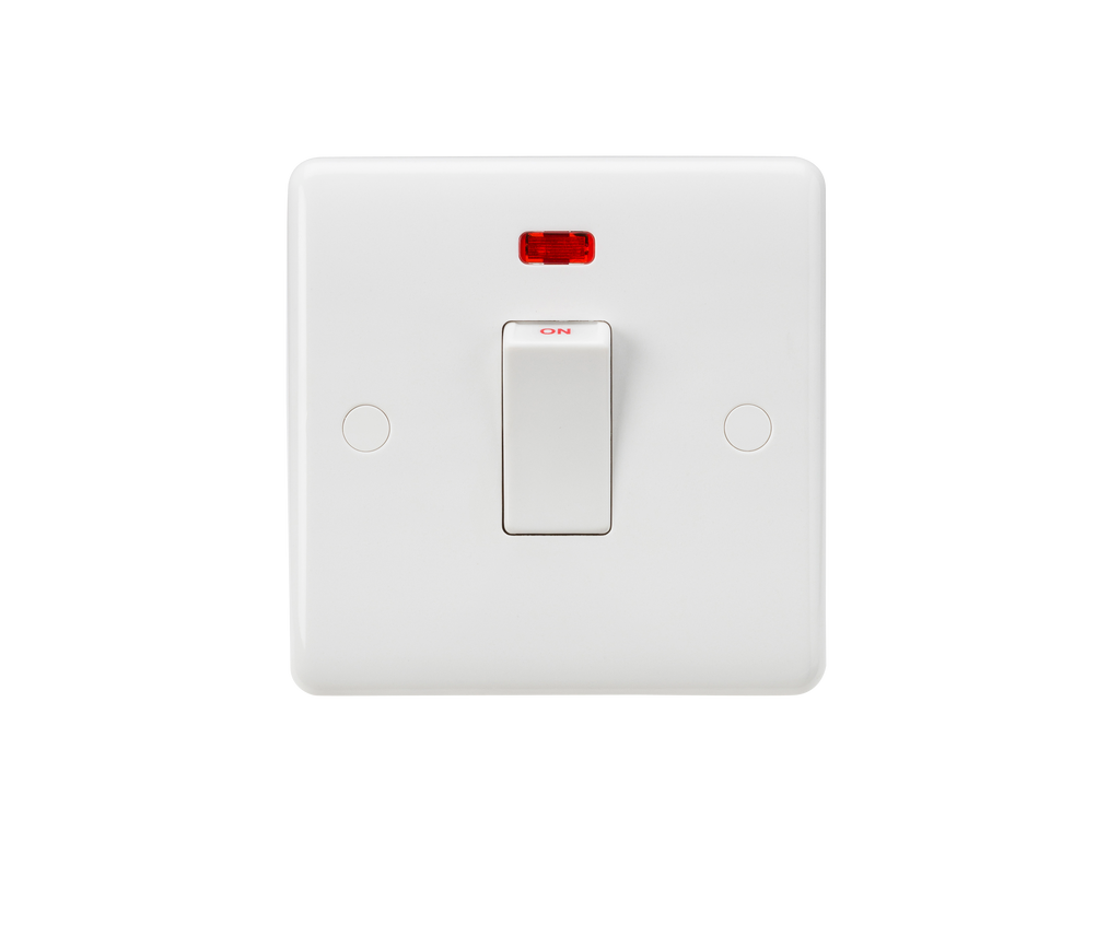 Gently contoured 7mm plate with rounded edges and anti-microbial properties - 45A rated - Double Pole - With neon indicator - Includes screw cap covers - Certified to EN 60669-1 - Supplied in Knightsbridge rip top polybag with euro slot
