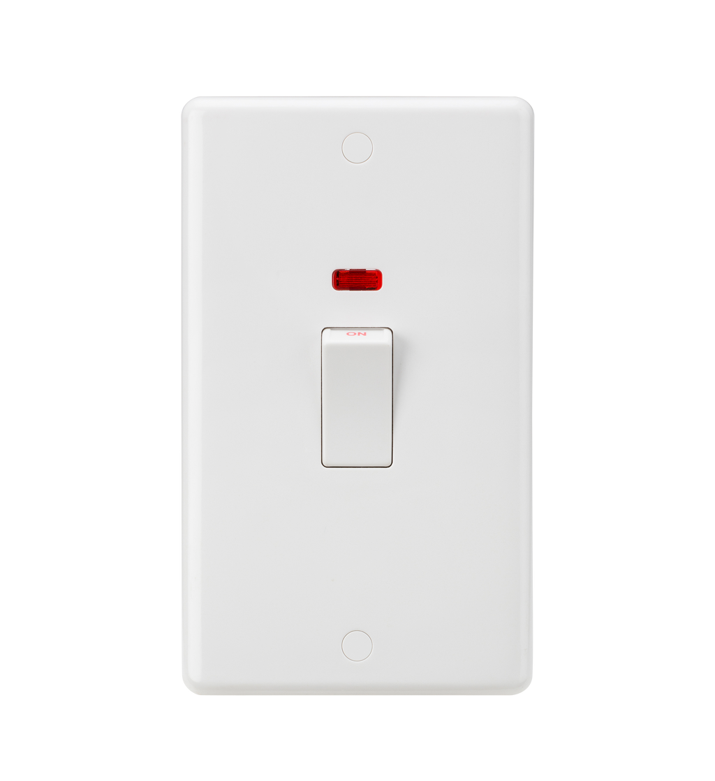Gently contoured 7mm plate with rounded edges and anti-microbial properties - 45A rated - Double Pole - With neon indicator - Includes screw cap covers - Certified to EN 60669-1 - Supplied in Knightsbridge rip top polybag with euro slot