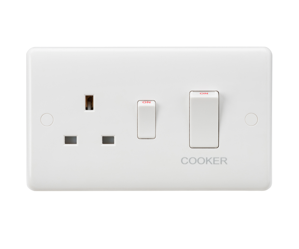 Gently contoured 7mm plate with rounded edges and anti-microbial properties - 45A DP Cooker Switch - 13A Switched Socket - Laser printed for cleaner look and longevity - Includes screw cap covers - Certified to BS 4177, BS 1363-2 - Supplied in Knightsbridge rip top polybag with euro slot