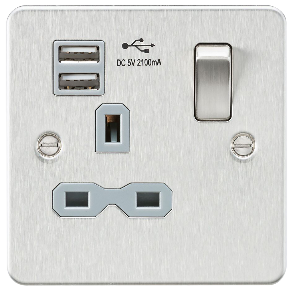 This charger socket is a great finishing touch to any modern home. Flat Plate low profile metal design with matching metal rocker. Built in Dual USB Charger - 13A Switched socket - Dual USB Charging 5V DC2.1A (shared) - Ultra low profile design with built in gasket - Certified to BS1363-2 - EMC Certified and ErP Ready - Minimum mounting box depth 25-35mm* *dependent on wiring conditions WE RECOMMEND YOU ALWAYS USE CERTIFIED USB CABLES FOR SAFETY AND TO ENSURE COMPATIBILITY