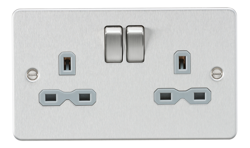 Perfect finishing touch to any modern home, ultra-low profile Flat Plate metal design with matching metal rockers, unique socket insert design that is completely hidden once a plug is inserted. - 13A 2G Switched Socket - Double Pole Switches - Fitted with twin earth terminals - Flat Plate low profile design with built in gasket - Certified to BS 1363:2 - Minimum mounting box depth 25mm