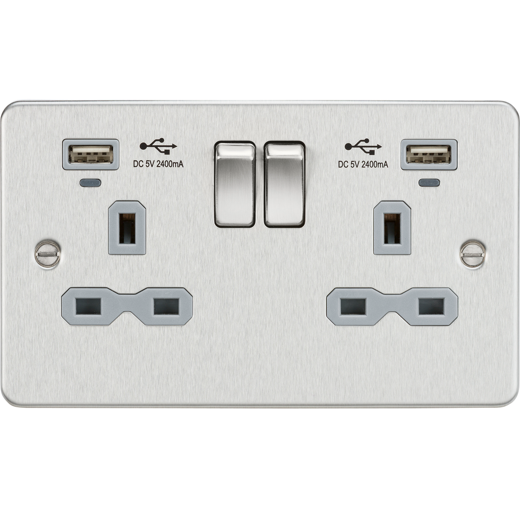 Flat plate 13A 2G switched socket with USB chargers (2.4A) - Brushed Chrome with grey insert