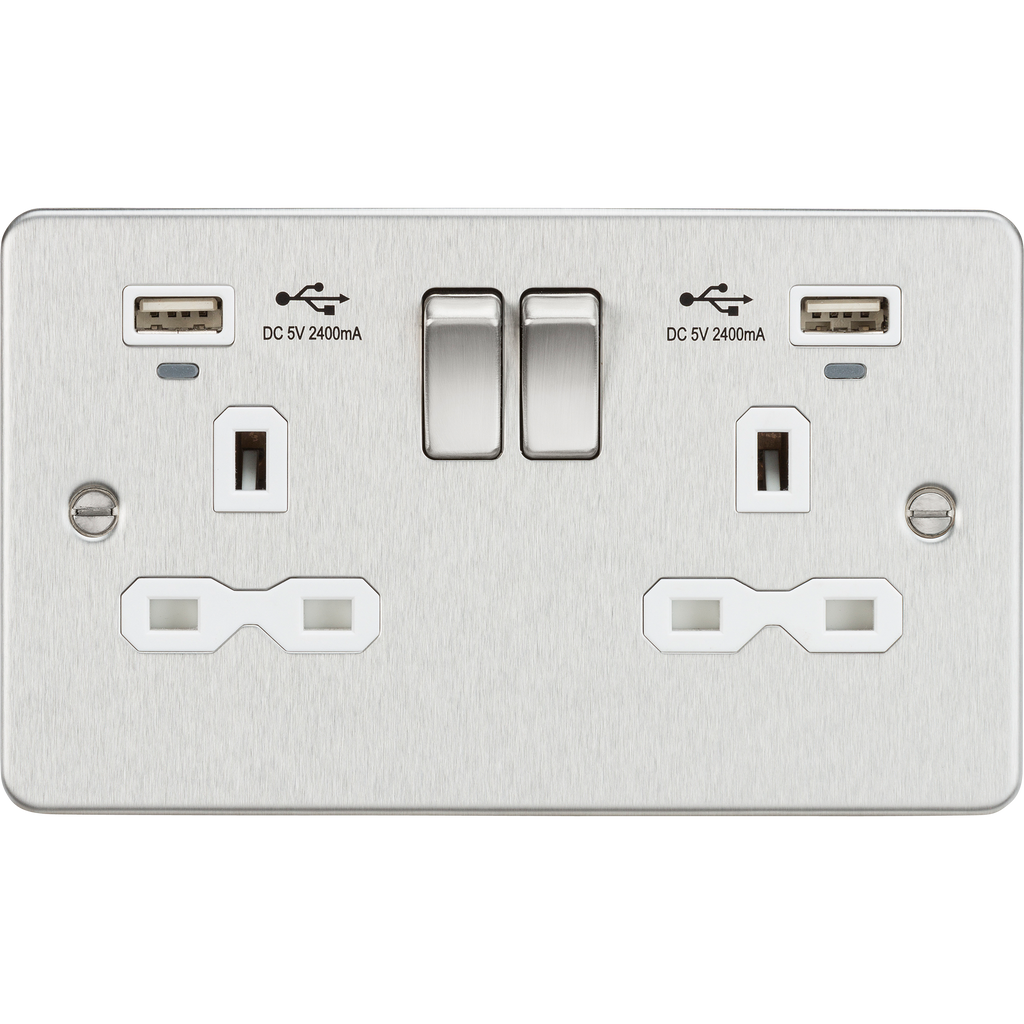 Flat Plate 13A 2G switched socket with USB chargers (2.4A) - Brushed Chrome with white insert