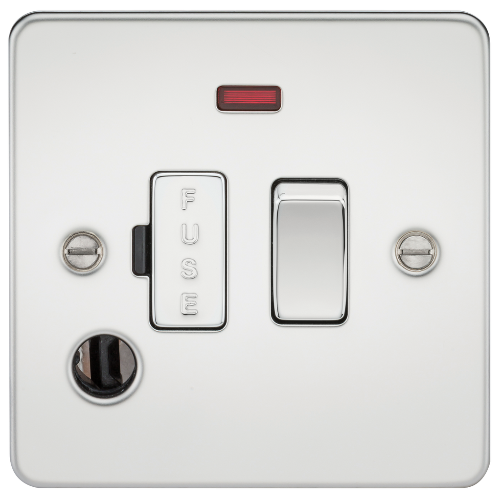 Fused spur solution in Flat Plate low profile metal design with matching fuse holder. - 13A rated - Switched - With neon indicator and flex outlet - Ultra low profile design with built in gasket - Certified to BS 1363-4 - Minimum mounting box depth 25mm