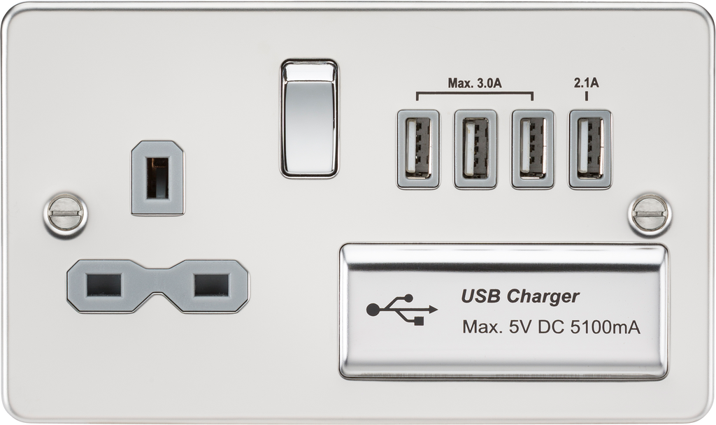 Ideal solution for multiple users, combining a 13A switched socket with a Quad USB charger. Flat Plate low profile metal design with matching metal rockers. Perfect for Coffee shops. foyers, receptions, hotel rooms etc. - 13A Switched socket - Quad USB Charging 5V DC5.1A (shared) - Dedicated 2.1A outlet for tablets - 3 outlets sharing 3A for multiple smart phones and other devices - Ultra low profile design with built in gasket - Certified to BS1363-2 - EMC Certified and ErP Ready - Minimum mounting box depth 25-35mm* *dependent on wiring conditions WE RECOMMEND YOU ALWAYS USE CERTIFIED USB CABLES FOR SAFETY AND TO ENSURE COMPATIBILITY