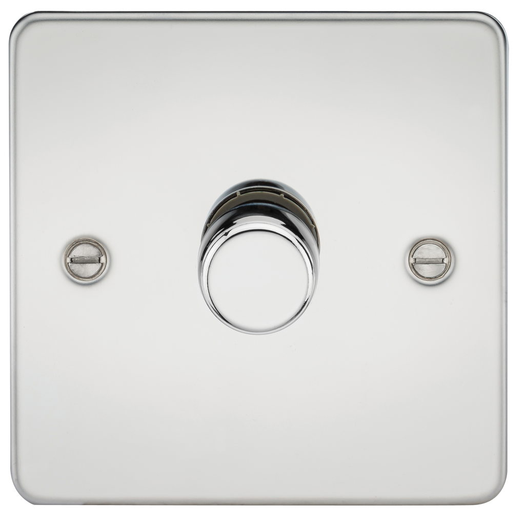 Perfect finishing touch to any modern home, Flat Plate low profile metal design with matching dimmer cap. - 10-200W Incandescent - 5-150W LED - 2-way - Push on/off - Trailing edge dimmer technology - Certified to EN 60669-2 - Minimum mounting box depth: 25mm NB: PLEASE CHECK WITH LAMP MANUFACTURER FOR COMPATIBILITY