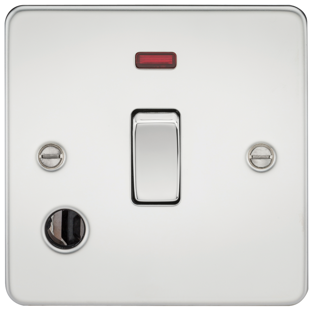 Ideal for fixed appliances such as water heaters, Flat Plate low profile metal design with matching rocker - 20A rated - Double pole - Switched - With neon indicator and flex outlet - Ultra low profile design with built in gasket - Certified to EN 60669-1 - Minimum mounting box depth 25mm