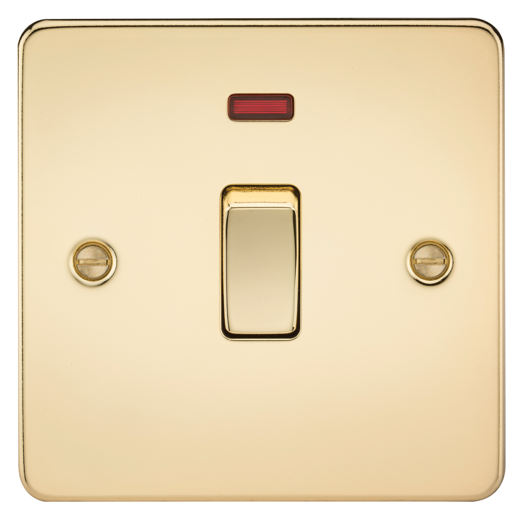 Ideal for fixed appliances such as water heaters, Flat Plate low profile metal design with matching rocker - 20A rated - Double pole - Switched - With neon indicator - Ultra low profile design with built in gasket - Certified to EN 60669-1 - Minimum mounting box depth 25mm