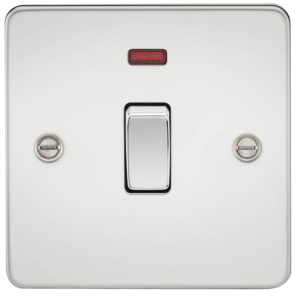 Ideal for fixed appliances such as water heaters, Flat Plate low profile metal design with matching rocker - 20A rated - Double pole - Switched - With neon indicator - Ultra low profile design with built in gasket - Certified to EN 60669-1 - Minimum mounting box depth 25mm