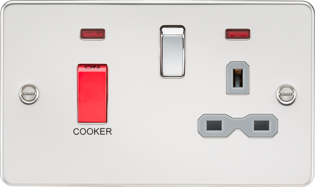Flat plate 45A DP switch and 13A switched socket with neon - polished chrome with grey insert