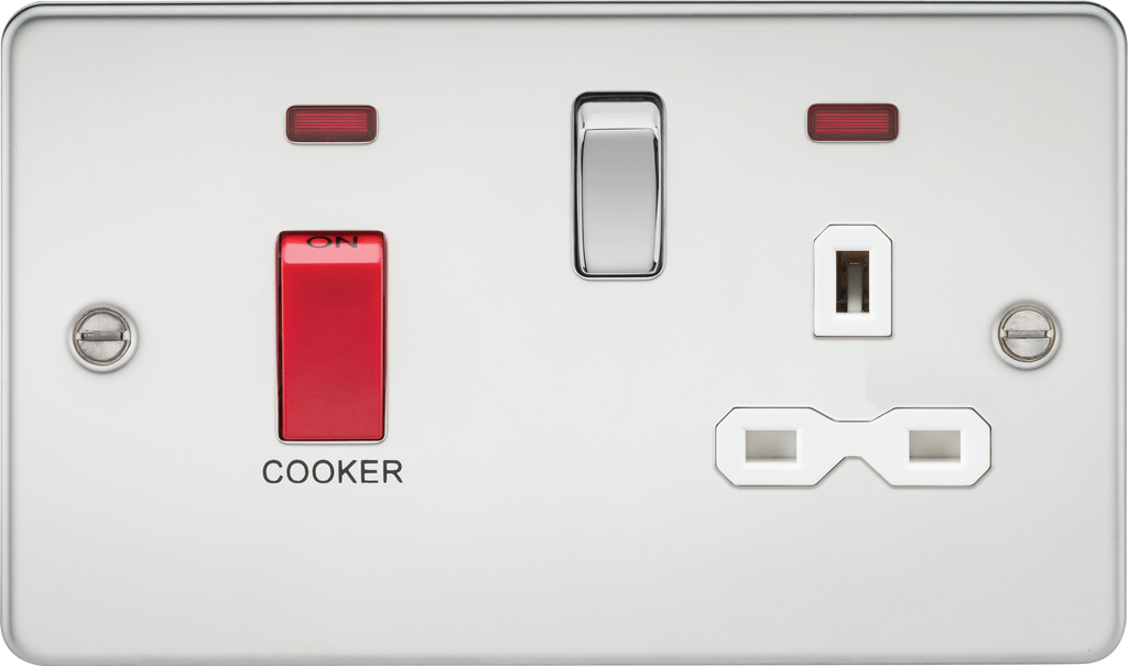 Flat plate 45A DP switch and 13A switched socket with neon - polished chrome with white insert