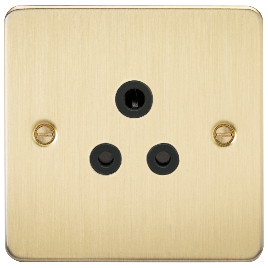 Ideal for use in custom lighting solutions, Flat Plate low profile metal design. - 5A round pin socket - Unswitched - Ultra low profile design with built in gasket - Certified to BS 546 - Minimum mounting box depth 25mm
