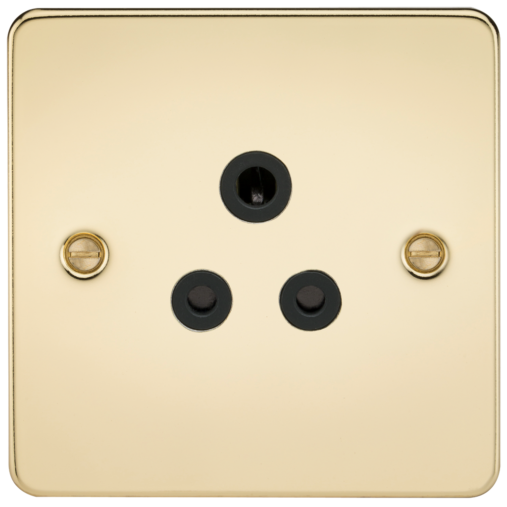 Ideal for use in custom lighting solutions, Flat Plate low profile metal design. - 5A round pin socket - Unswitched - Ultra low profile design with built in gasket - Certified to BS 546 - Minimum mounting box depth 25mm