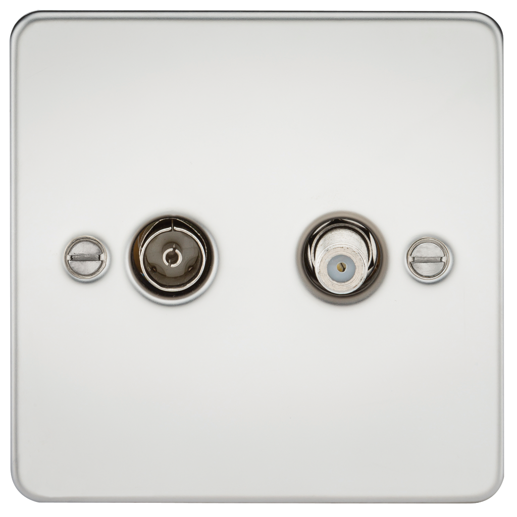 Ideal for TV/Coax and SAT TV/F-type connections (Isolated). Isolated outlets are for use with communal dishes and aerial installations. The isolated socket blocks interference from neighboring installs i.e. an apartment block. Flat Plate low profile design - 1 x Coaxial TV outlet - 1 x F-Type SAT TV Outlet - Isolated - Ultra low profile design with built in gasket - Certified to BS 5733 - Minimum mounting box depth: 25mm