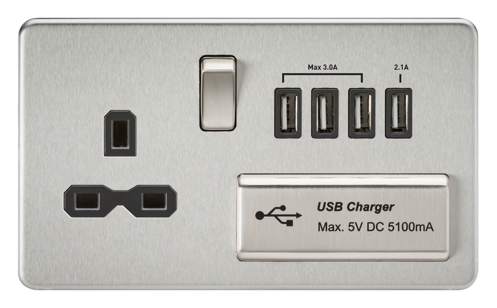 Ideal solution for multiple users, combining a 13A switched socket with a Quad USB charger. Screwless low profile metal design with matching metal rockers. Perfect for Coffee shops. foyers, receptions, hotel rooms etc. - 13A Switched socket - Quad USB Charging 5V DC5.1A (shared) - Dedicated 2.1A outlet for tablets - 3 outlets sharing 3A for multiple smart phones and other devices - Screwless low profile design with built in gasket - Certified to BS1363-2 - EMC Certified and ErP Ready - Minimum mounting box depth 25-35mm* *dependent on wiring conditions WE RECOMMEND YOU ALWAYS USE CERTIFIED USB CABLES FOR SAFETY AND TO ENSURE COMPATIBILITY