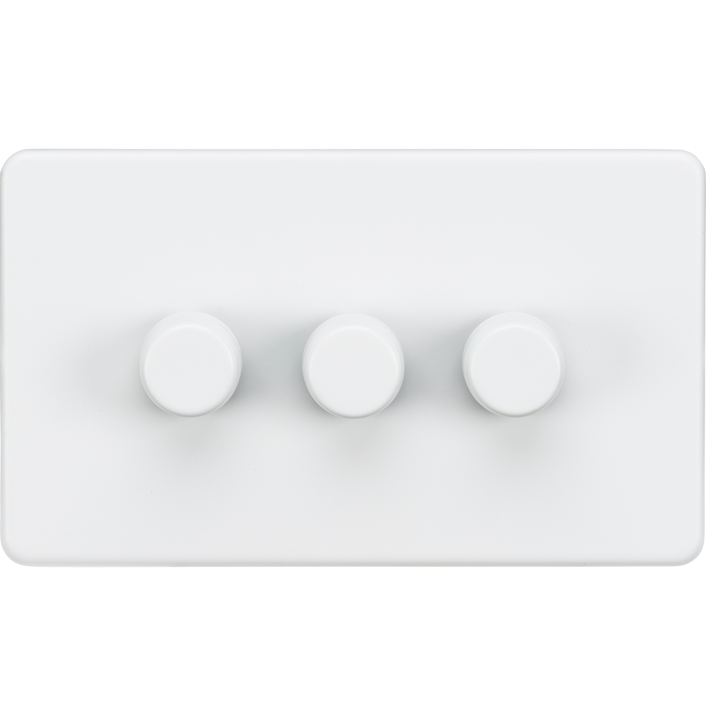Perfect finishing touch to any modern home, flawless Screwless low profile metal design with matching dimmer caps. - 10-200W Incandescent - 5-150W LED - 2-way - Push on/off - Trailing edge dimmer technology - Certified to EN 60669-2 - Minimum mounting box depth: 25mm NB: PLEASE CHECK WITH LAMP MANUFACTURER FOR COMPATIBILITY