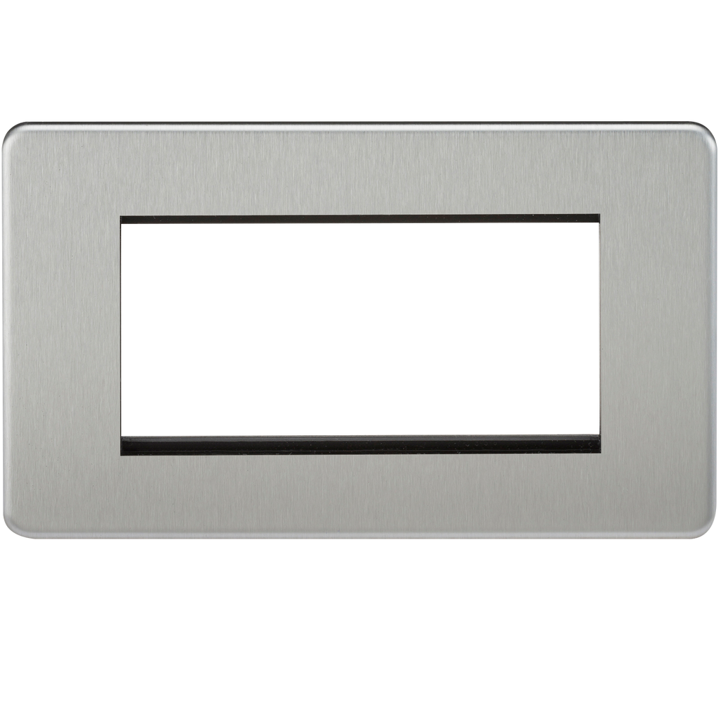 Suitable for use with euro module inserts. Ideal for creating bespoke TV/DATA/HDMI/USB/TEL installations. Flawless Screwless design - Accepts four 25 x 50mm , or two 50 x 50mm euro module or a combination of both - Screwless low profile design with built in gasket - Minimum mounting box depth: dependent on euro module used