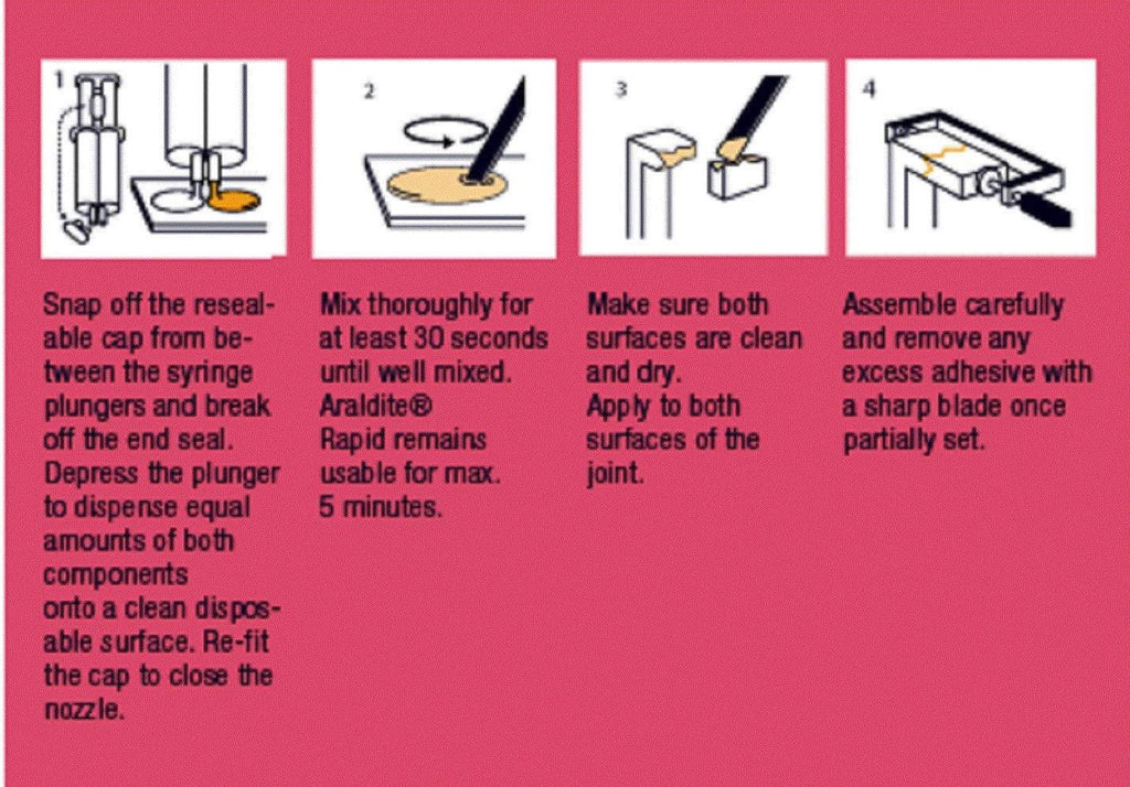 A solvent-free, 2-part, epoxy adhesive. Strong, long-lasting and rapid setting. Water-resistant and can be painted or sanded to a smooth finish. Bonds metal, wood, masonry, ceramics, glass, dry concrete, chipboard, leather, cardboard, fabric, rubber and most hard plastics (excluding Polyethylene, Polypropylene, and Teflon®).