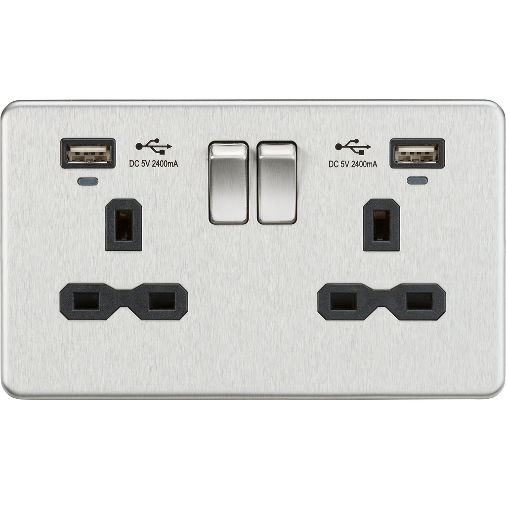 13A 2G Switched Socket, Dual USB (2.4A) with LED Charge Indicators - Brushed Chrome w/ Black Insert (SFR9904NBC)/ or White Insert (SFR9904NBCW)