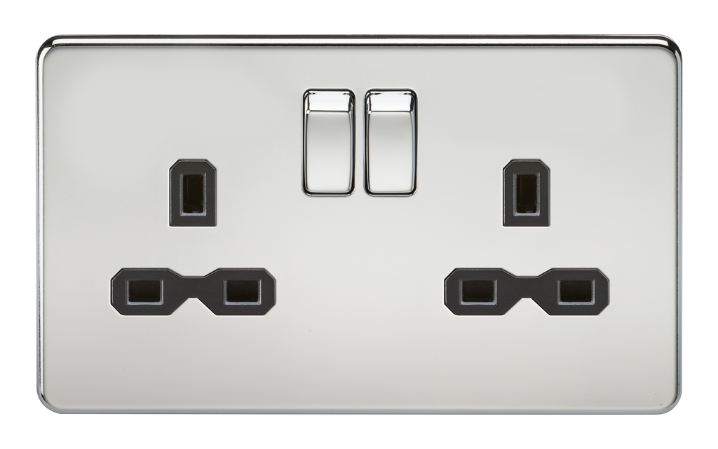 The Knightsbridge SF9000PC / SF9000PCW 13A 2G Polished Chrome Switched Socket is ideal for use in the modern home, businesses and hotels. The screwless design features an easy clip-on cover with an internal gasket for moisture protection and matching screws. It has an ultra-slim profile and is constructed from durable, and high-temperature resistant thermoset plastic.