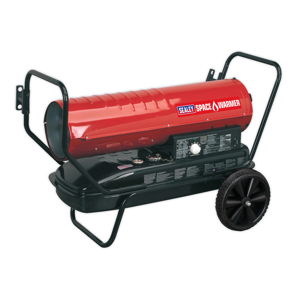 This Indstrial AB1008 Space Warmer Heater 100,000Btu/hr with Wheels can use paraffin, kerosene, or diesel as fuel, is fitted with a thermostat and digital temperature display given in °C, offering more control over what temperature you wish to set.