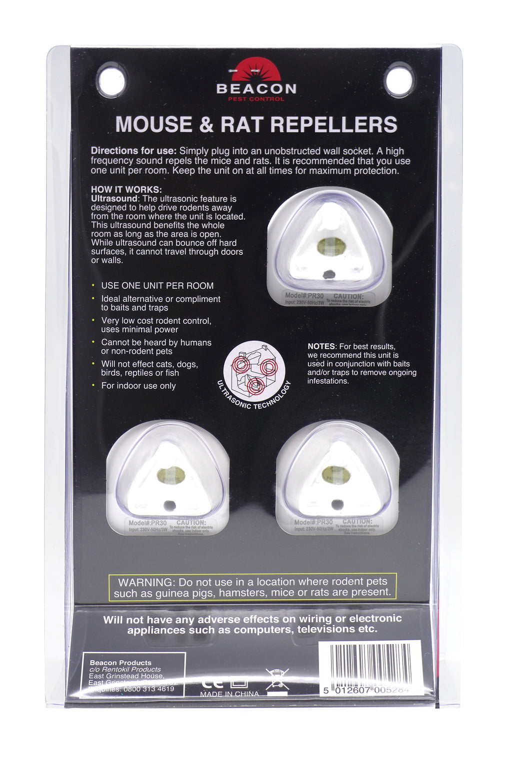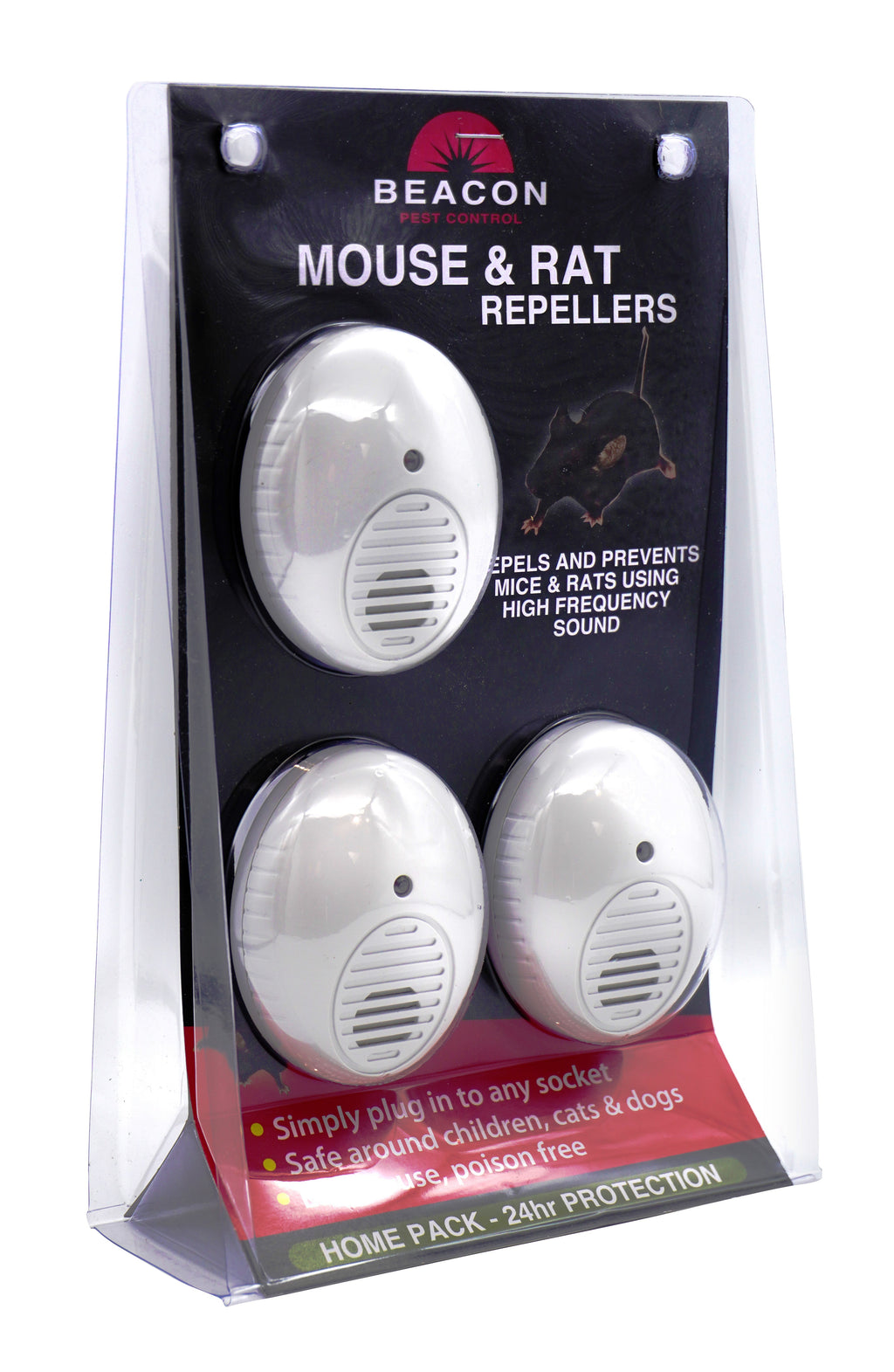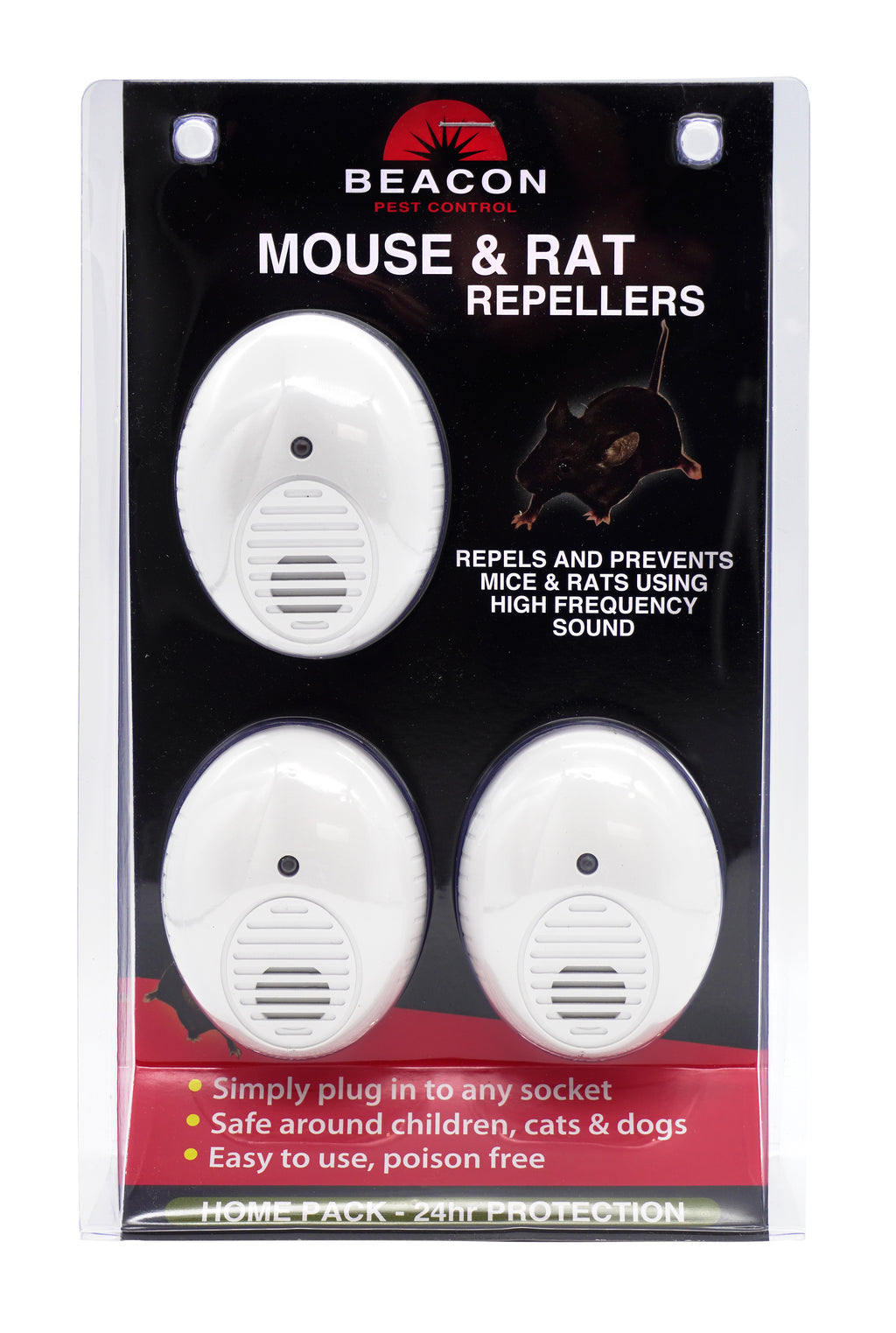 A dual action triple pack mouse and rat repeller that uses the most up-to-date electromagnetic technology to drive mice and rats from your home. Simply plug into an unobstructed wall socket and it will send out a high-frequency sound that repels mice and rats.