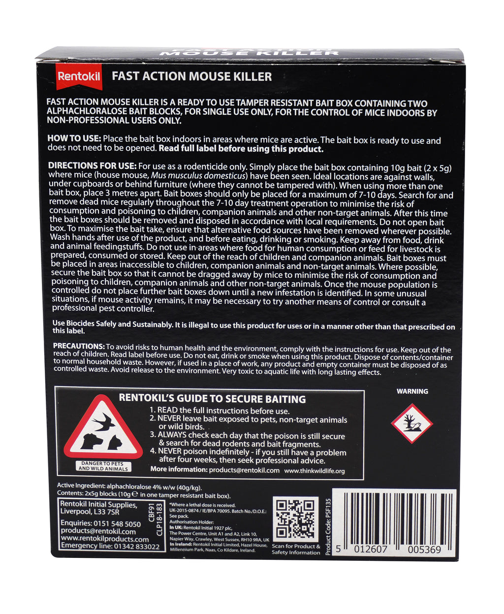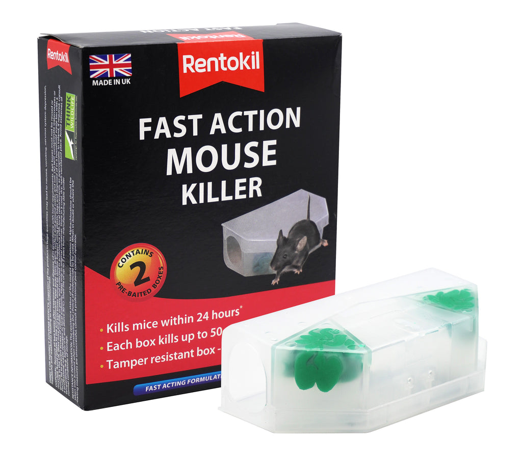 Fast Action Mouse Killer is a unique, highly palatable and effective rodenticide product, which kills mice within 24 hours. There is sufficient bait to kill up to about 100 mice. The bait is held securely in pre-baited boxes making it a child and pet-friendly system.