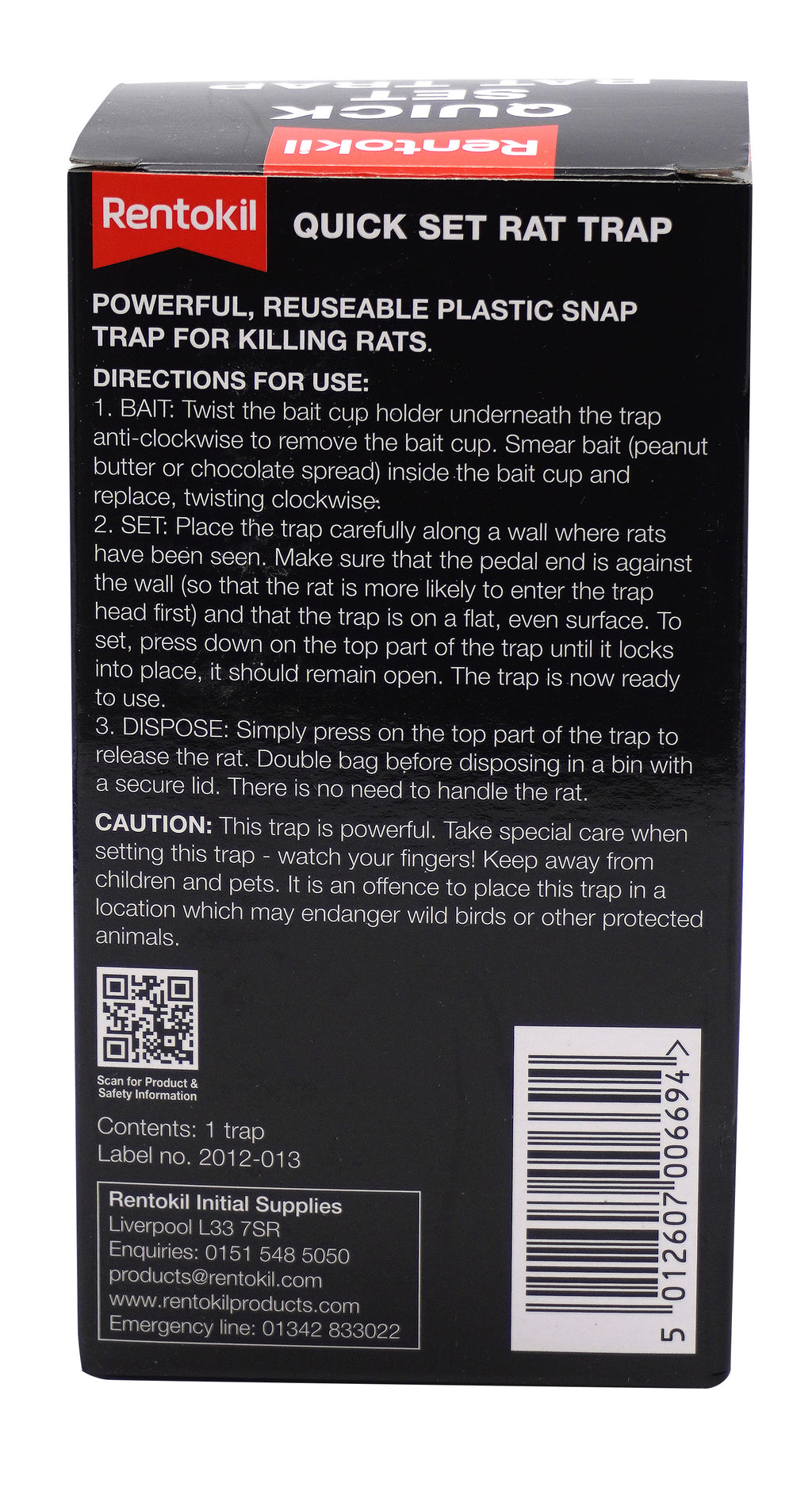 The quick set rat trap is a powerful, reusable, poison-free plastic snap trap for killing rats. Simply bait the cup and click back the trap set to set it. After catching a rat, simply push the back of the trap to release. Minimal handling is needed.