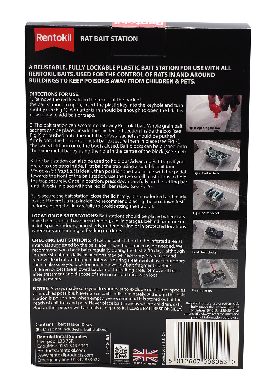 Follow the full instructions before use. Open the bait station and put bait securely inside. Close the bait station and place it in areas where rats have been seen. Exclude ALL pets and children during use and remove all baits before allowing them back into the treatment area.