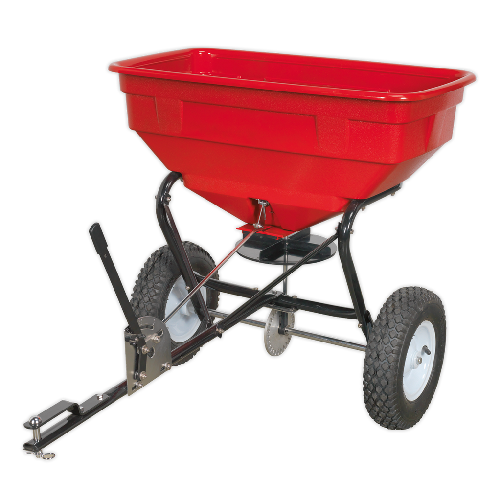 Manufactured with a strong tubular steel frame and polypropylene dispensing hopper. Pin hitch design attaches to ride-on lawnmowers, can be converted to ball hitch using Model No. TB36*. Fitted with aluminium gear, rain cover, pneumatic tyres and adjustable feed system. Includes hopper screen to ease spreader flow and filter out unwanted contaminants. Sprays in 360° motion to cover a large area. Suitable for a variety of horticultural agents including grit, seed, salt, fertilizer and weed killer.* Some modification may be required.