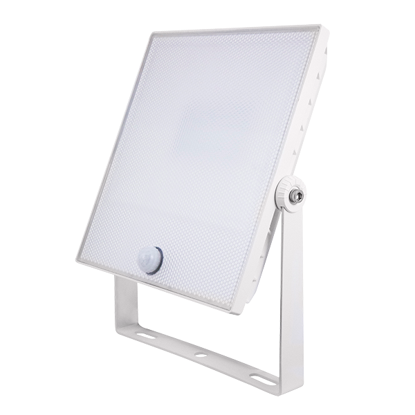 30W LED Flood Light in White or Black 4000K Colour Temperature 2400 Lumen Output Built-in PIR: 110° Detection Angle, 8m Range with Pre-set 150 Seconds Activation Period Auto Lux Control 1 Meter Power Cord IP65 Ingress Protection for Exterior Use Manual Override Function Robust Construction Textured Diffuser Adjustable Bracket Dimensions: 143mm H x 123mm W x 24mm D (Ex. Bracket) Includes Fixing Accessories