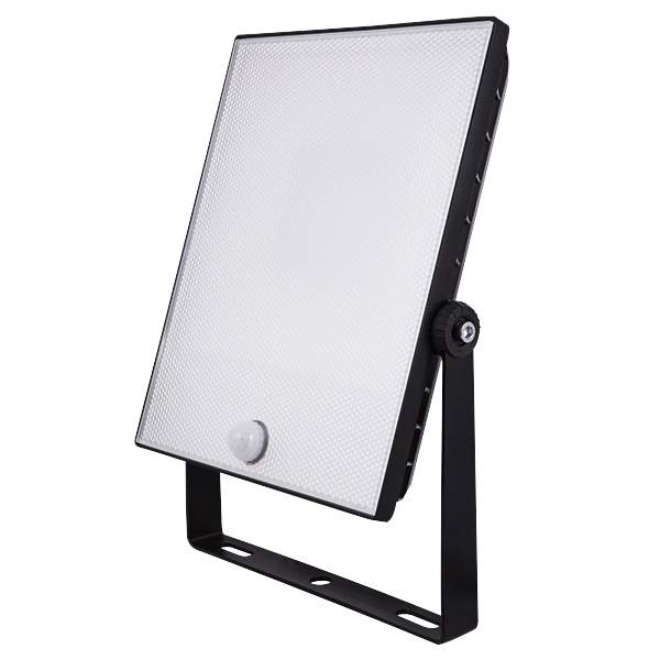 50W LED Flood Light in Black or White 4000K Colour Temperature 4000 Lumen Output Built-in PIR: 110° Detection Angle, 8m Range with Pre-set 150 Seconds Activation Period Auto Lux Control 1 Meter Power Cord IP65 Ingress Protection for Exterior Use Manual Override Function Robust Construction Textured Diffuser Adjustable Bracket Dimensions: 216mm H x 186mm W x 24mm D (Ex. Bracket) Includes Fixing Accessories