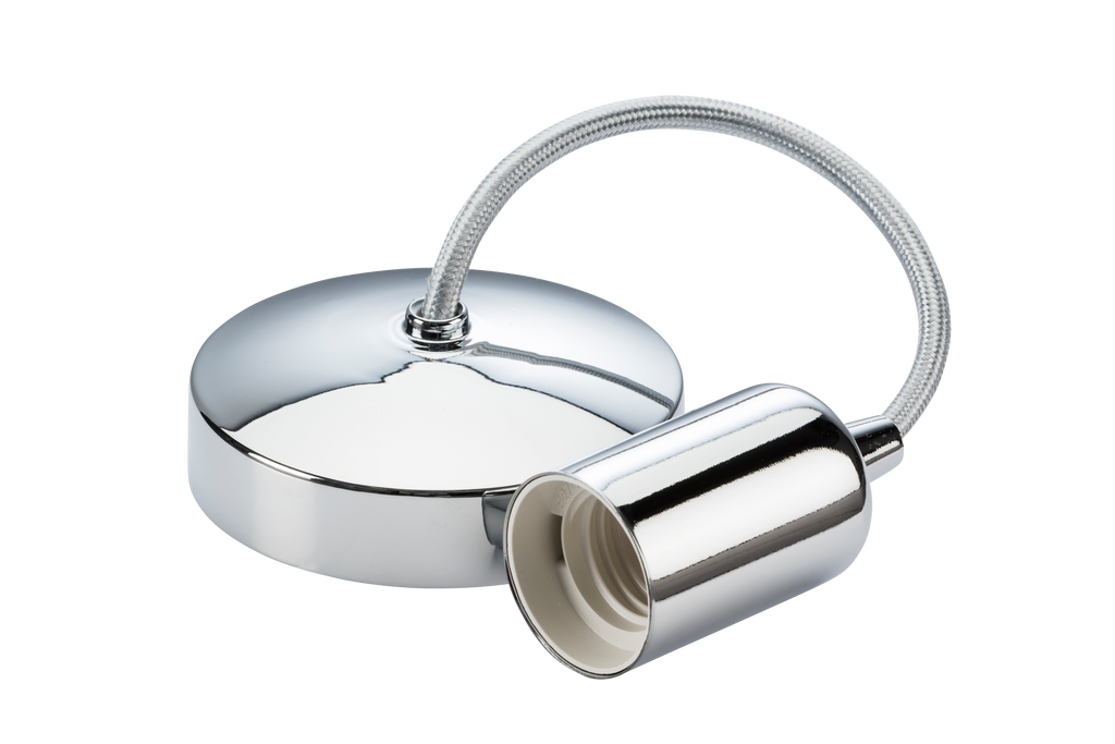 Contemporary style metal pendant lamp holder. Pre-wired to reduce time on installation. - T2 rated 80W Incandescent /LED - E27 lamp base - Fixed drop - Pre-wired - Terminal capacity: 2 x 1.5mm² - Certified to BS EN 60598-2-1, BS EN 60598-1