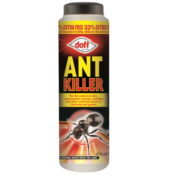 DOFF® Ant Killer is an insecticide powder for use against ants, cockroaches, earwigs, woodlice and other crawling insects in domestic premises. For use indoors and outdoors, on floors, around cupboards, in cracks and crevices, along runs in and around nests, and at points of entry to the property. Supplied in an easy to use 400 gram bottle.