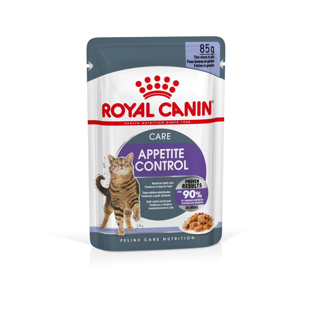 Neutered cats can be prone to excess weight gain, as well as begging for more food in between their normal mealtimes. Your cat’s hunger can be satisfied, and their body weight maintained by a diet that is specially formulated to meet their specific nutritional needs. ROYAL CANIN® Appetite Control Care in Jelly is a tailor-made formula created to support neutered adult cats by helping to control begging behaviour and help limit excess weight gain. To help limit excess weight gain and maintain your cat’s ideal body weight, ROYAL CANIN® Appetite Control Care in Jelly is formulated with a precise energy content and a moderate fat content. L-Carnitine is also included because it helps with healthy fat metabolism. Begging for food is behaviour that can be modified simply by a change in diet. The specific moisture content in ROYAL CANIN® Appetite Control Care in Jelly will help to satisfy your cat’s appetite. This wet food formula helps to regulate your cat’s hunger while stimulating the feeling of being comfortable and full. When tested in an internal study, the results of ROYAL CANIN® Appetite Control Care in Jelly were a proven success. Over 90% of the cat owners partaking in the study said that after just 4 weeks of eating this food, their cat’s begging behaviour had been controlled. To appeal to each cat’s appetite, ROYAL CANIN® Appetite Control Care comes in two other wet food textures: Gravy and Loaf. It is also available as dry food with crunchy kibble. If your cat enjoys a combination of both wet and dry food, be sure to follow the on-pack feeding guide to make sure you serve the optimal amount of each. Each nutritionally complete recipe in the ROYAL CANIN® Appetite Control Care range for cats is tailor-made to help support your cat’s health and wellbeing by meeting and managing its unique nutritional needs.