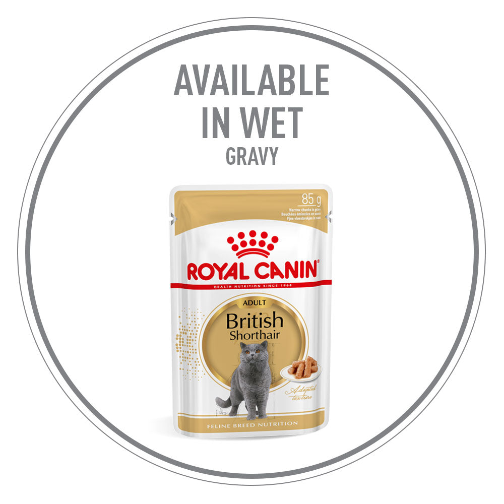 Helps support a healthy urinary system.Although your British Shorthair cat is now a fully-fledged adult with the world at its paws, it still needs complete and balanced nutritional support to maintain good overall health. ROYAL CANIN® British Shorthair Adult in Gravy is specially formulated with all the nutritional needs of your British Shorthair cat in mind. The British Shorthair typically has a sturdy, heavy and muscular body. As a naturally solid and powerful cat, your cat’s weight should primarily derive from muscle instead of fat. Therefore, the right nutrients (as well as correct portion sizes) are essential. ROYAL CANIN® British Shorthair Adult in Gravy contains a moderate energy level and an adapted fat content (3.2%) for effective weight management – this reduces the likelihood of any unwanted excess weight gain. To help maintain the health of your cat’s short, dense and plush coat, ROYAL CANIN® British Shorthair Adult in Gravy contains a specific balance of nutrients, including a variety of vitamins, to not only maintain a healthy and well-nourished coat, but also to support and maintain healthy skin. What’s more, the specially formulated balance of minerals in ROYAL CANIN® British Shorthair Adult in Gravy helps to maintain urinary health by supporting healthy urinary function in your cat. To cater to each cat’s individual preferences, ROYAL CANIN® British Shorthair Adult is also available as dry food, with crunchy and tasty kibbles. If you’re considering mixed feeding, simply follow our feeding guidelines to ensure your cat gets an accurate amount of both wet and dry food for optimal benefit. At ROYAL CANIN® we’re committed to providing nutritional solutions to your pet’s needs. All of our products undergo an extensive quality control process in order to guarantee the optimum quality of food as well as catering to your cat’s specific dietary requirements and lifestyle. This means that when your cat eats ROYAL CANIN® British Shorthair Adult in Gravy, it’s getting a complete and balanced diet.