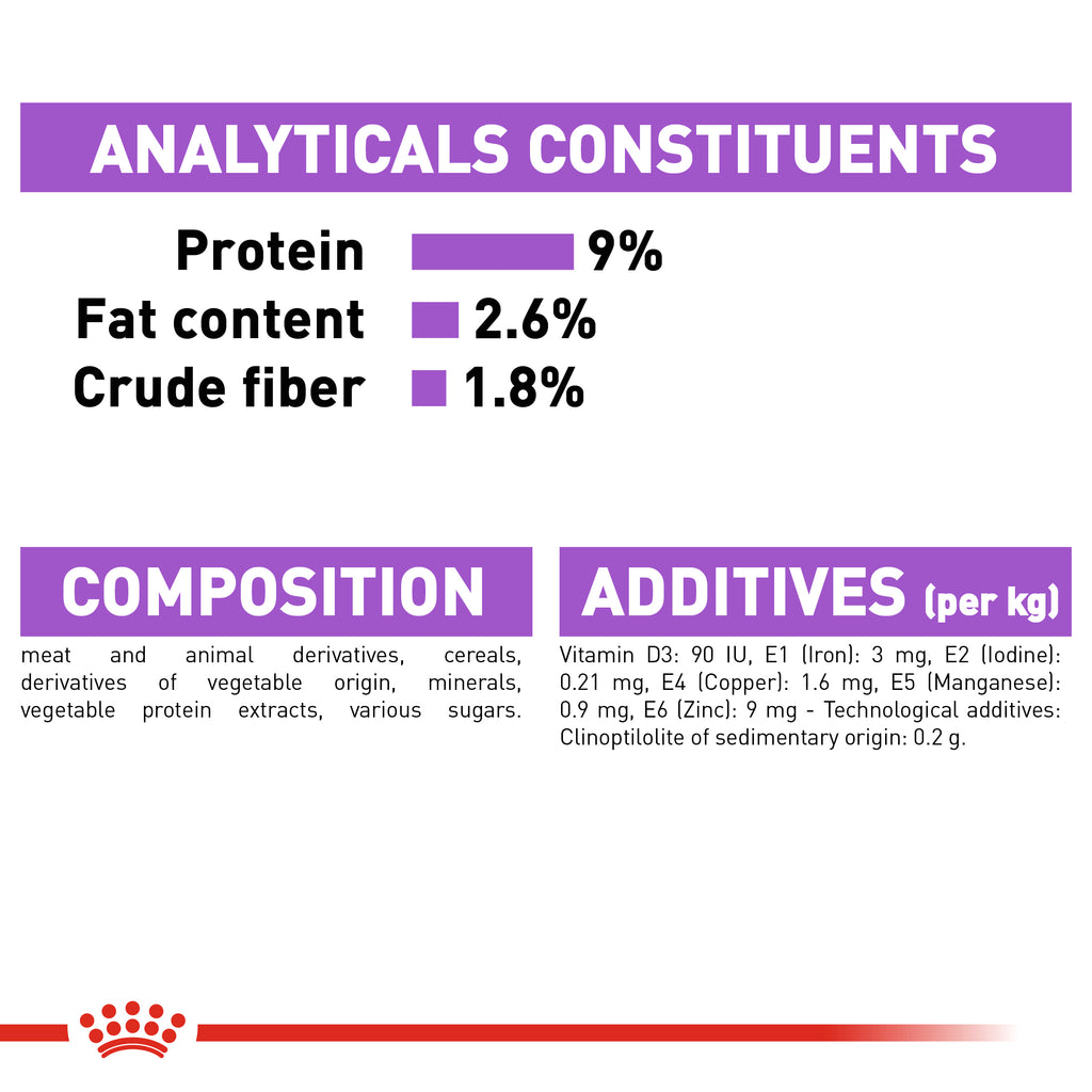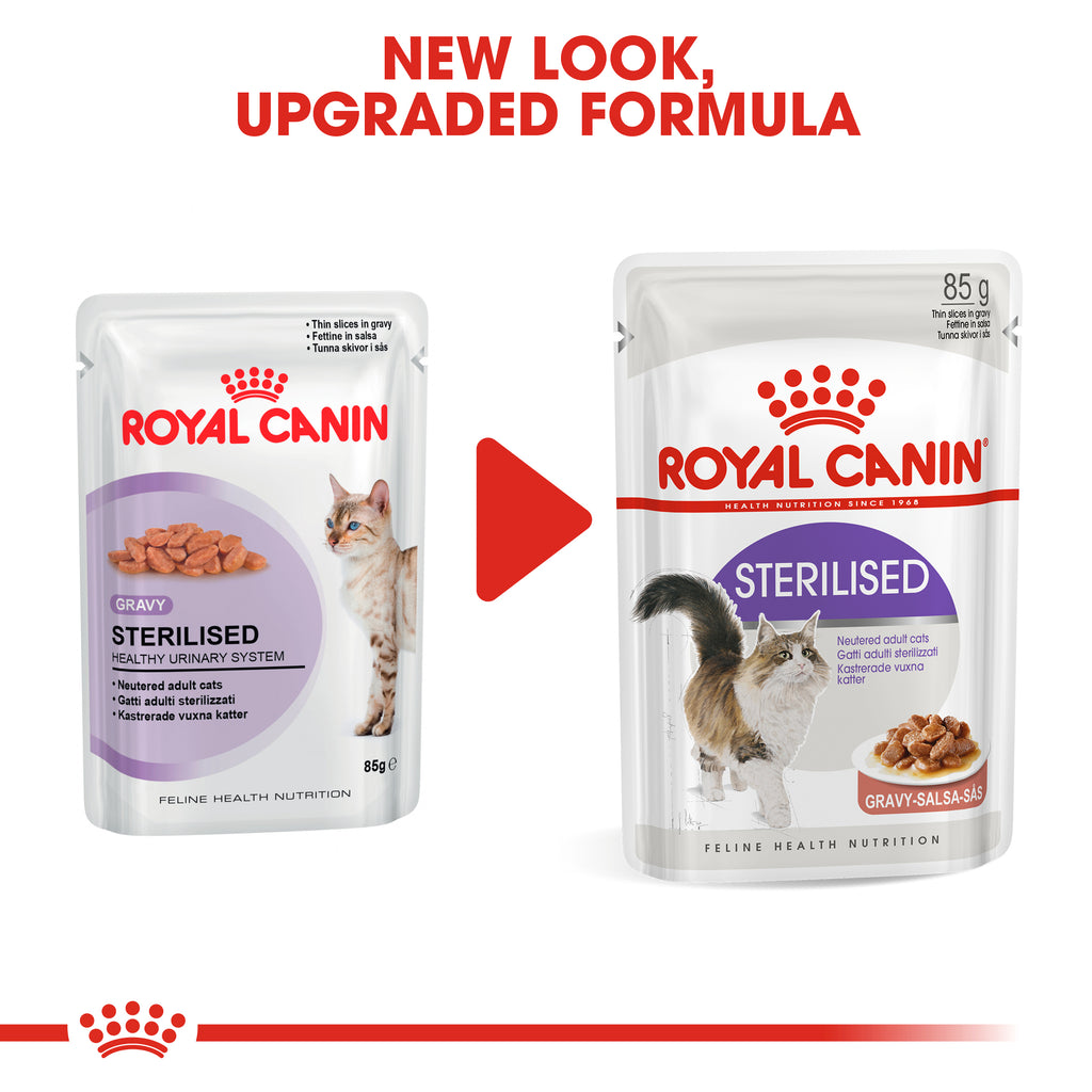 Formulated to match the optimal Macro Nutritional Profile instinctively preferred by adult cats.Sterilised cats have different requirements compared to cats that haven’t been neutered or spayed. They will have lower energy needs due to the changes that have taken place in their body as a result of sterilisation, which often results in reduced levels of activity. That’s why ROYAL CANIN® Sterilised in Gravy is specially formulated with the nutritional needs of your neutered adult cat in mind. With a controlled energy content and a moderate level of fat, ROYAL CANIN® Sterilised in Gravy helps to limit the chances of your cat gaining an excess weight; particularly when served in adequate daily rations. ROYAL CANIN® Sterilised in Gravy is enriched with L-Carnitine, which converts fatty acids into energy and has a positive effect on your cat’s metabolism, while the increased protein content will help to maintain healthy muscle mass. A beneficial diet for your cat is always easier to maintain when your cat shows a preference for the food it eats. That’s why ROYAL CANIN® Sterilised in Gravy is formulated to match the optimal nutritional profile instinctively preferred by adult cats – to ensure that they consume the nutrients that they need to maintain good overall health. ROYAL CANIN® Sterilised in Gravy also contains a carefully-considered balance of minerals that helps to support the health of your cat’s urinary system. To cater to each cat’s individual preferences, ROYAL CANIN® Sterilised is also available as wet food in a soft and tasty loaf, or as dry food in a tasty and crunchy kibble. If you’re considering mixed feeding, simply follow our feeding guidelines to ensure your cat gets an accurate amount of both wet and dry food for optimal benefit. At ROYAL CANIN® we’re committed to providing nutritional solutions to your pet’s needs. All of our products undergo an extensive quality control process in order to guarantee the optimum quality of food as well as catering to your cat’s specific dietary requirements and lifestyle. This means that when your cat eats ROYAL CANIN® Sterilised in Gravy, it’s getting a complete and balanced diet.