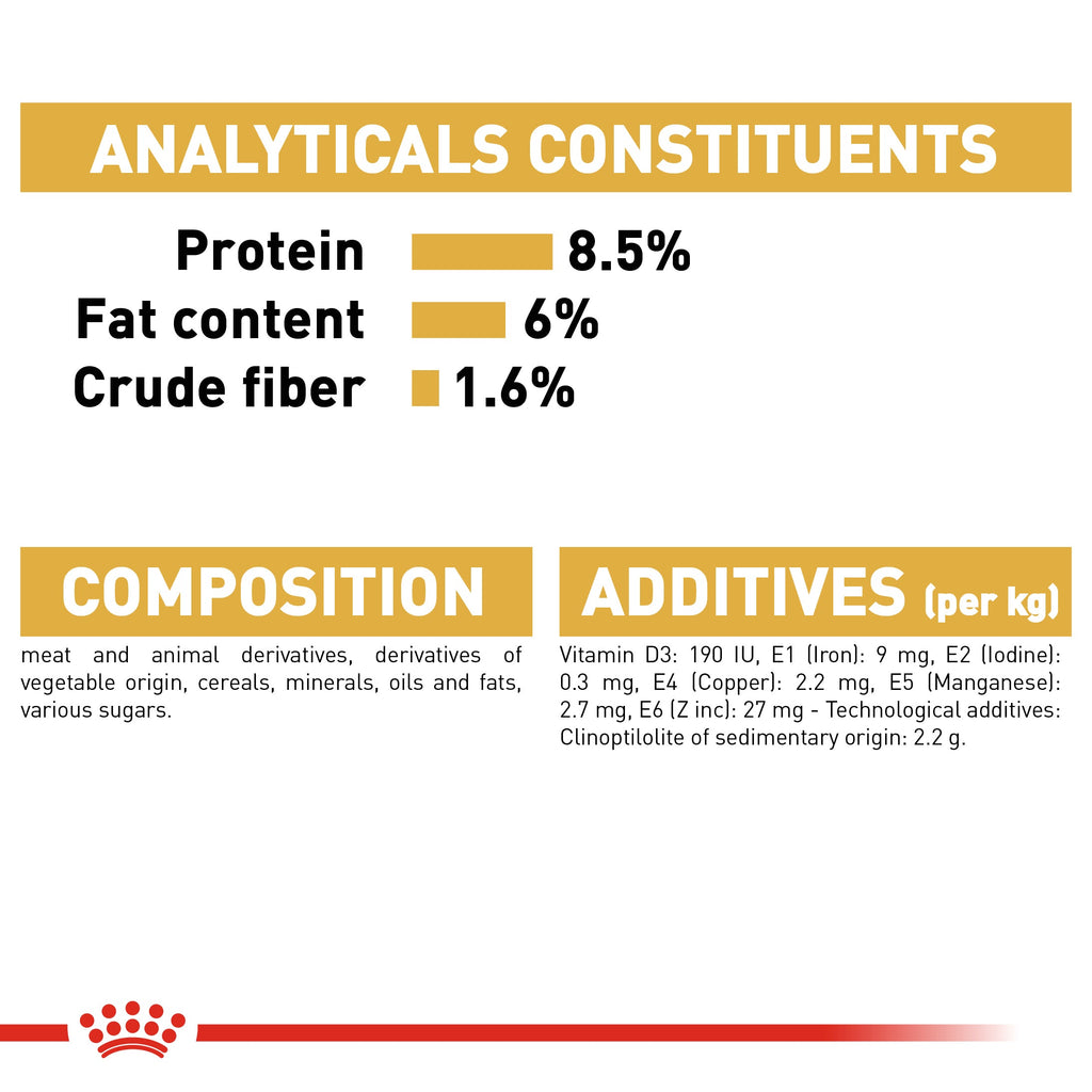 Compostion: Meat and animal derivatives, derivatives of vegetable origin, cereals, minerals, oils and fats, various sugars. Crude ash: 2.2%. Crude fibre: 1.6%. Crude oil fats: 6%. Moisture: 80%. Protein: 8.5%.