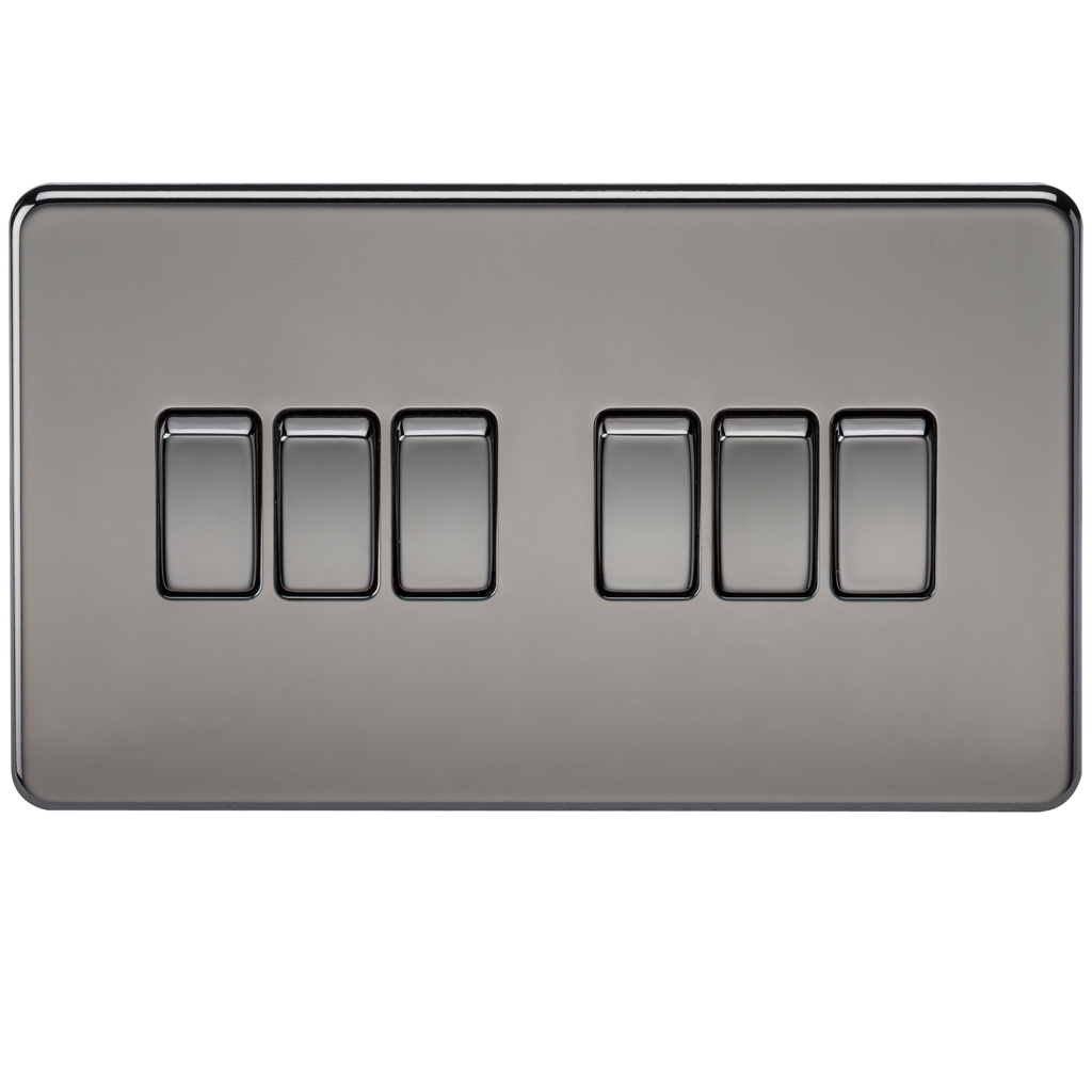 The Knightsbridge 6G 10 Amp 2 way Screwless Switch in Black Nickel is the ideal decorative upgrade for use in the modern home, businesses and hotels. The screwless design features an easy clip on cover with an internal gasket for moisture protection and matching screws. It has an ultra slim profile and is constructed from durable and high temperature resistant thermoset plastic.