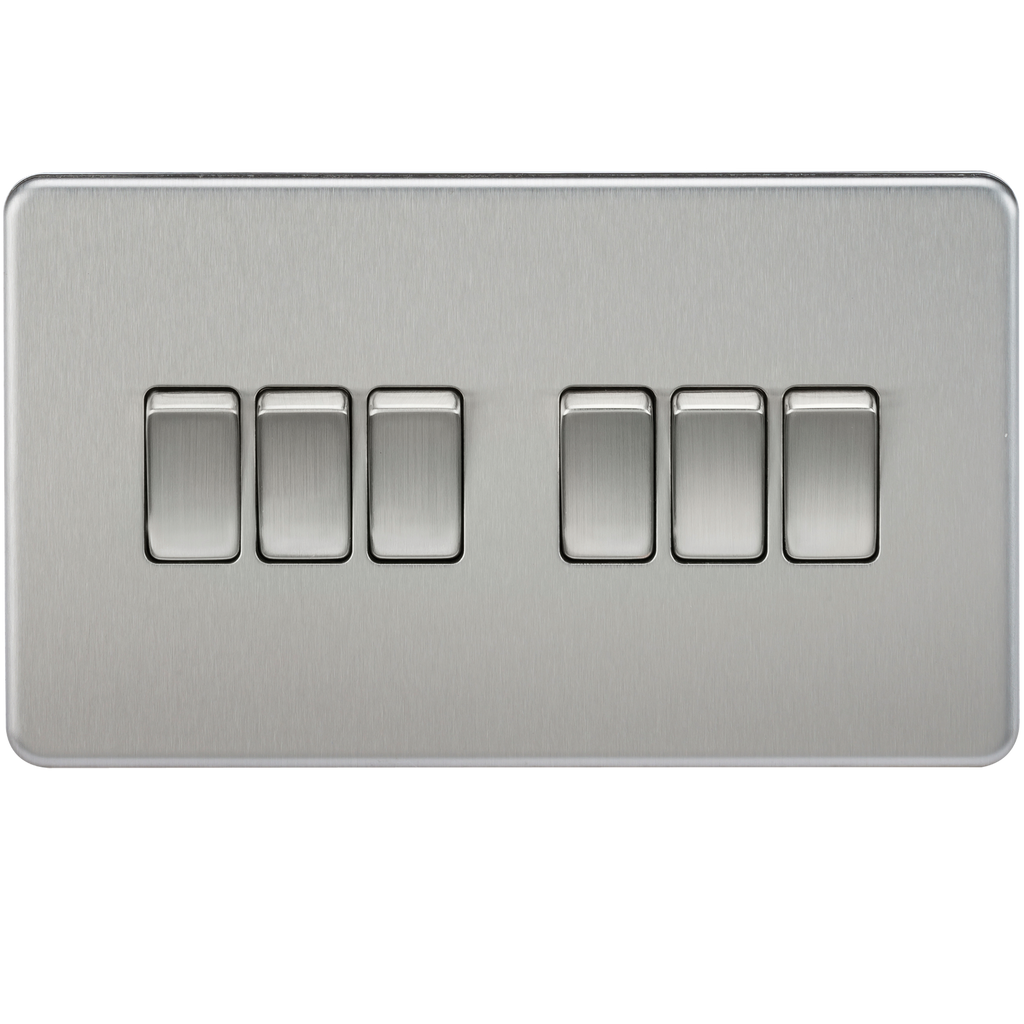 The Knightsbridge 10 Amp 6G 2 way Screwless Range of Switches in Brushed Chrome are the ideal decorative upgrade for use in the modern home, businesses and hotels. The screwless design features an easy clip on cover with an internal gasket for moisture protection and matching screws. It has an ultra slim profile and is constructed from durable and high temperature resistant thermoset plastic.