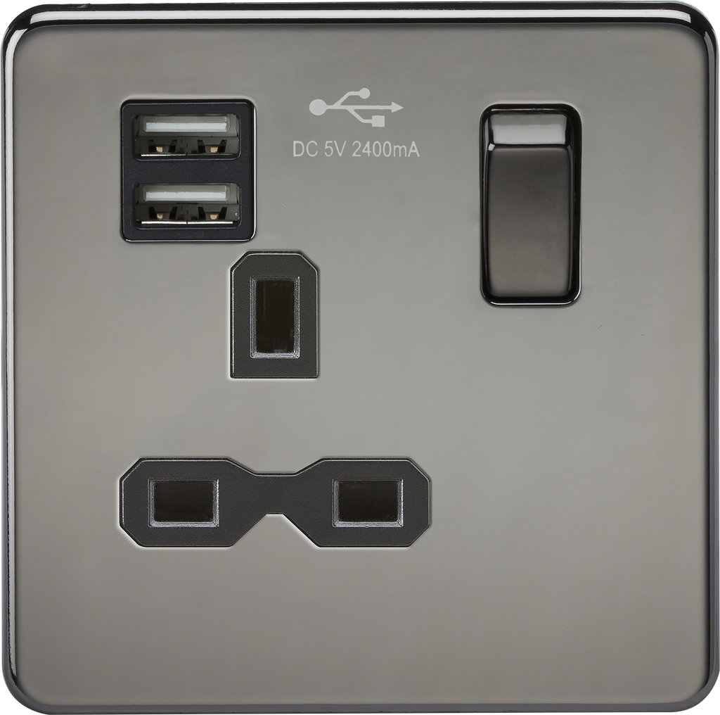 1G 13A Screwless Black Nickel 1G Switched Socket with Dual 5V USB Charger Ports - Black Insert