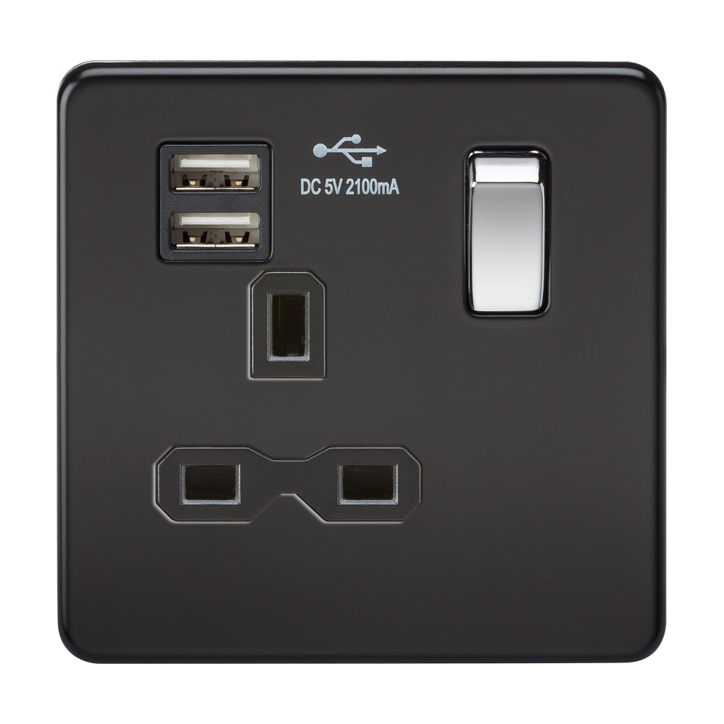 The Knightsbridge SF9901MB 13A 1G Matt Black Switched Socket with Dual USB is ideal for use in the modern home, businesses and hotels. The screwless design features an easy clip on cover with an internal gasket for moisture protection and matching screws. It has an ultra slim profile and is constructed from durable, and high temperature resistant thermoset plastic.