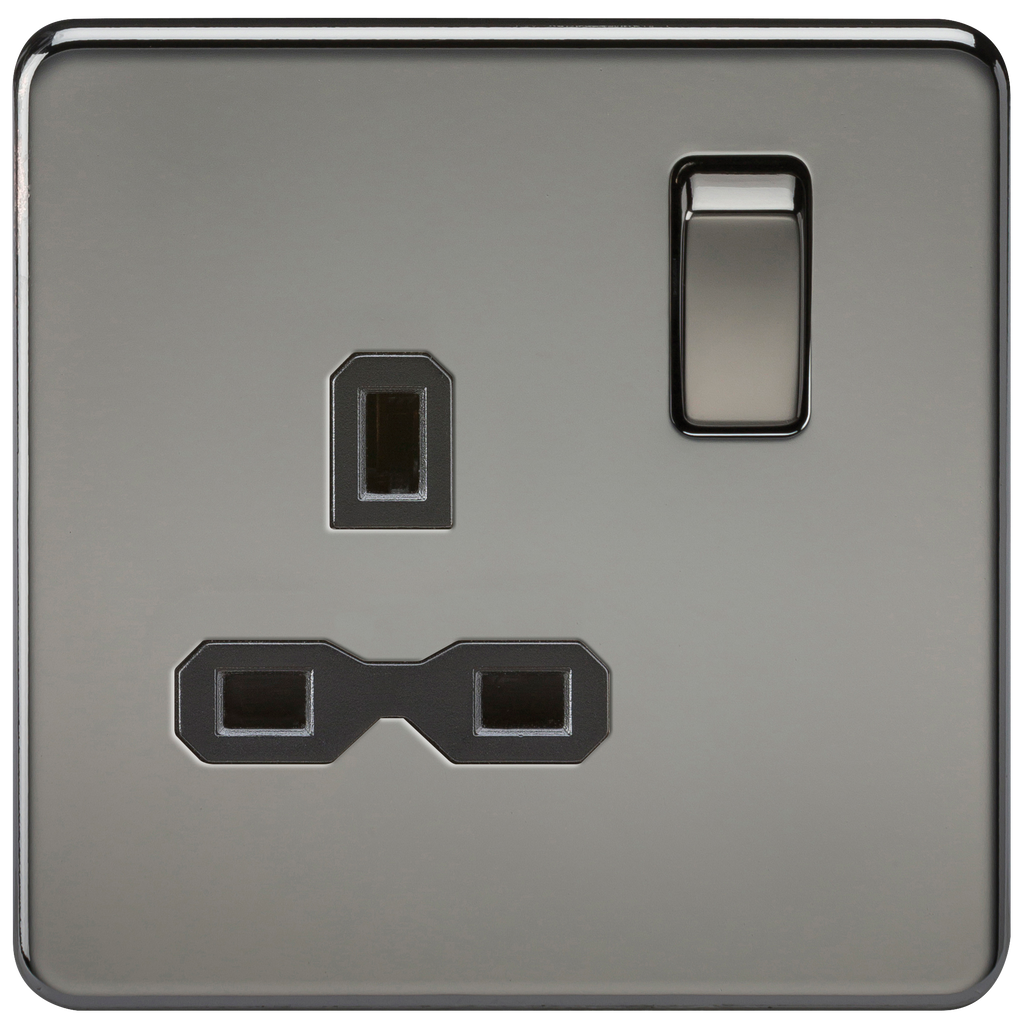 The Knightsbridge SF7000BN / SF7000BNW 13A 1G Black Nickel Switched Socket is the ideal decorative upgrade for use in the modern home, businesses and hotels. The screwless design features an easy clip-on cover with an internal gasket for moisture protection and matching screws. It has an ultra-slim profile and is constructed from durable, and high-temperature resistant thermoset plastic.