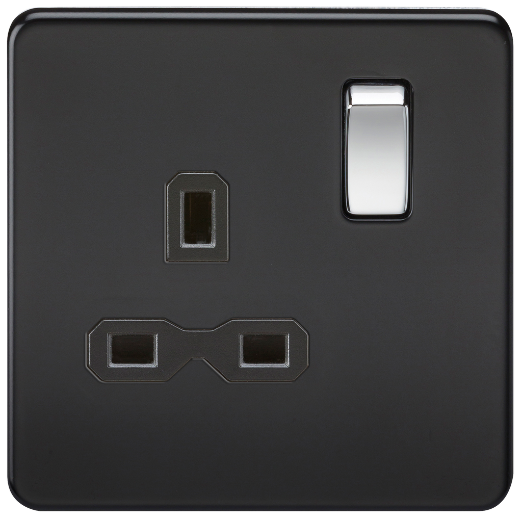 The Knightsbridge SF7000MB 13A 1G Matt Black Switched Socket is the ideal decorative upgrade for use in the modern home, businesses and hotels. The screwless design features an easy clip on cover with an internal gasket for moisture protection and matching screws. It has an ultra slim profile and is constructed from durable, and high temperature resistant thermoset plastic.